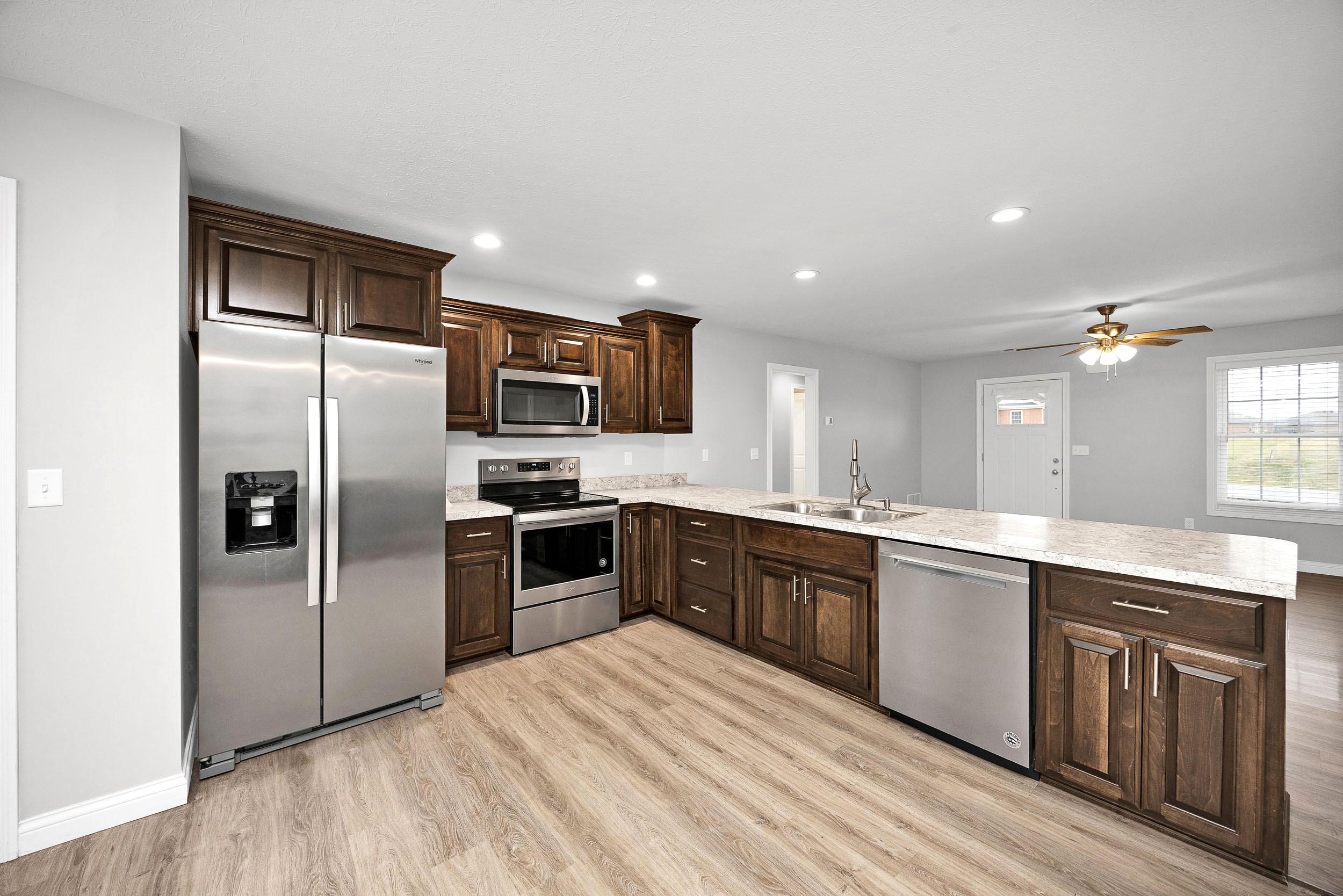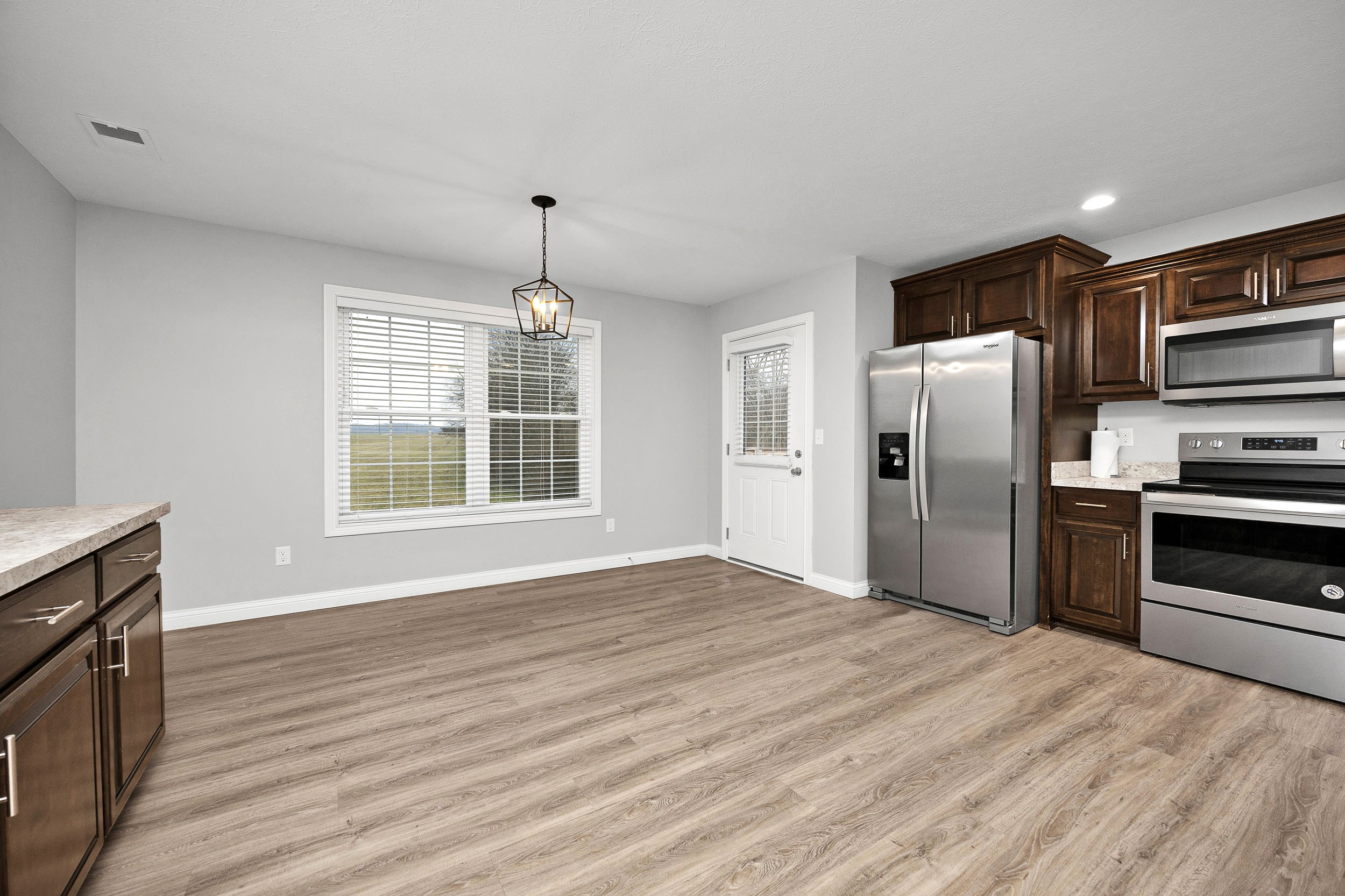 Welcome to this gorgeous brick ranch conveniently located just off the Lebanon Bypass in the scenic Ridge View Subdivision! Come on in to be greeted by a delightful open concept that starts off in the living room. The living room is a spacious yet cozy area and like much of the home… is laid with an exquisite luxury vinyl plank floor. Flowing from the living room is a dazzling kitchen souped-up with a sumptuous assortment of rich-colored cabinetry equipped with sleek silver handles for an elevated touch plus loads counterspace that wraps into a magnificent bar offering an abundance of seating space. The kitchen is also souped-up with matching Whirlpool stainless-steel appliances (refrigerator, dishwasher, stove, and microwave) that shine under the array of recessed lights. Not to mention the matching buffet that provides even more counter and cabinet space while also servicing as the perfect coffee bar! Rounding out the kitchen is a quaint dining area highlighted by a stylish light fixture and a pair of sun-enticing windows to invite soothing natural light into the room. Nestled on its own wing of the home is the beautiful primary bedroom complete with an ensuite bath. This bath features a fabulous dual vanity, a fashionable tile floor, large walk-in closet, and a handy linen closet. Situated on the other wing of the home are 2 more generously sized bedrooms accompanied by another snazzy full bath and a sizable laundry room where as an added bonus… the washer & dryer stay too! Rounding out the home is the climate-controlled attached 2-car garage sporting a slick troweled concrete floor with room left over for storage space or tinkering jobs. The home is surrounded by vibrant and picturesque landscaping anchored by low-maintenance rock. Then when it is time to just sit back and relax… take a seat in the grill and chill zone on the splendid rear deck that looks out into the fenced-in backyard which is also a great spot for kids and pets to play! Call CHASE LANCASTER for all the details on your new home today!
